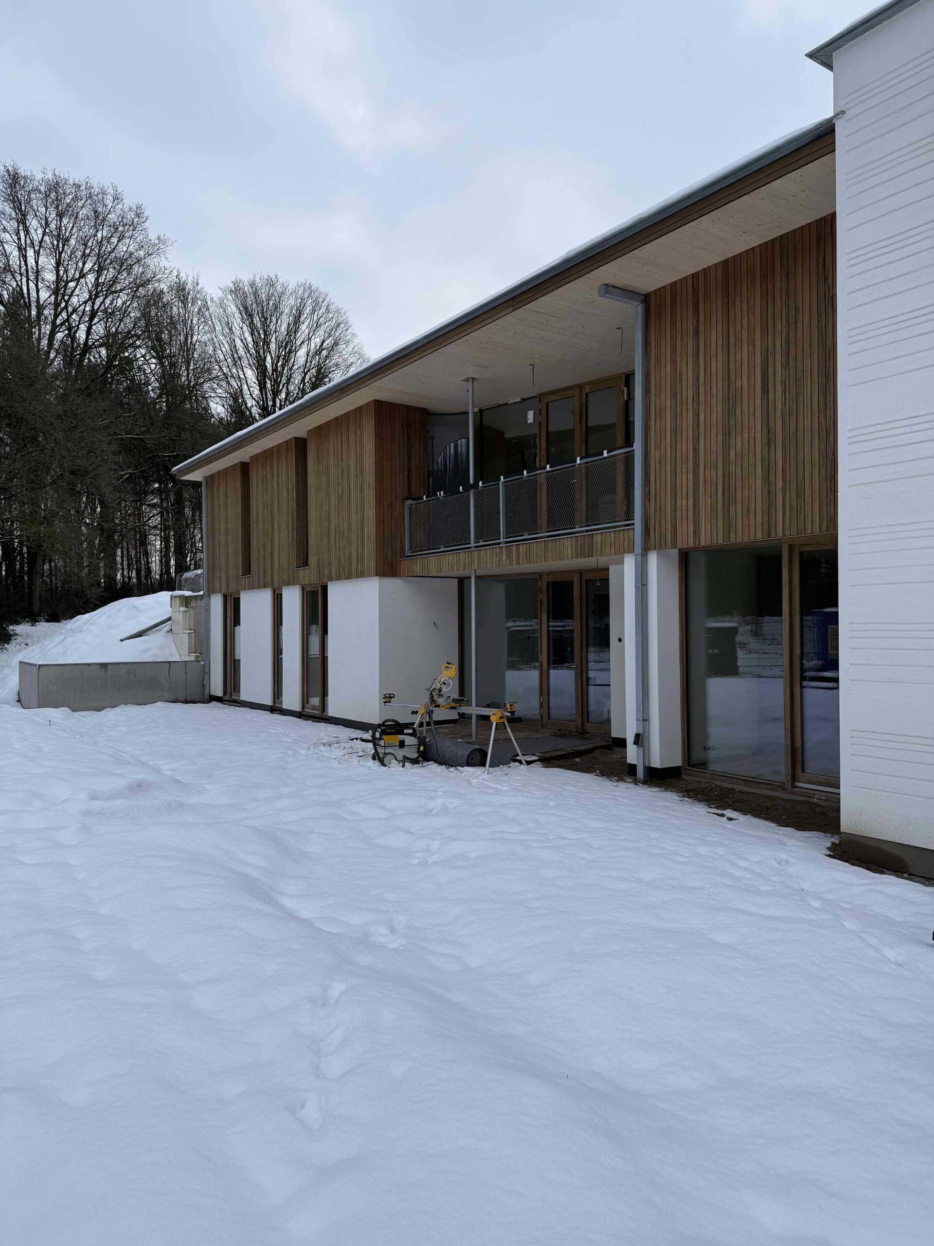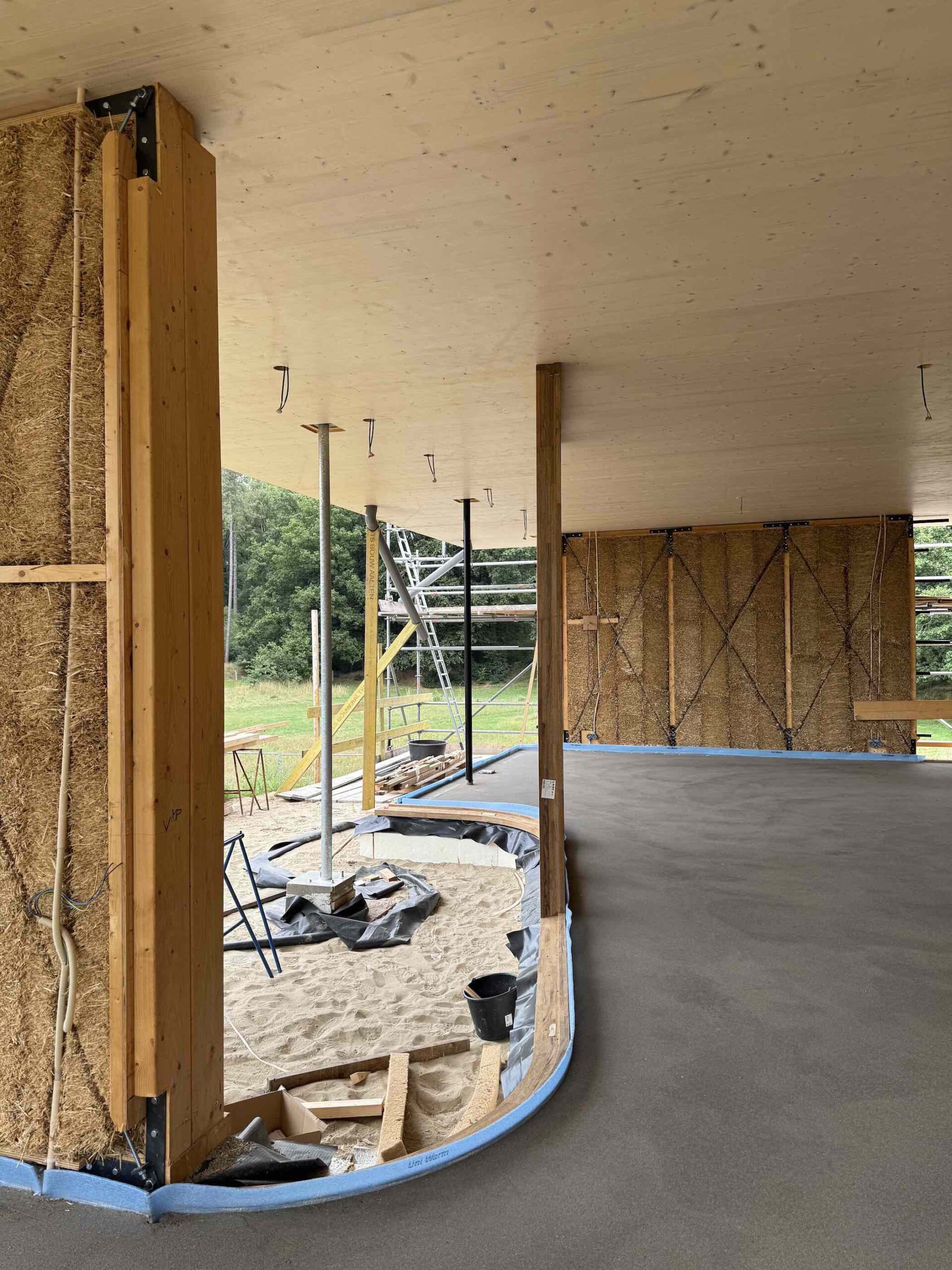 De villa is opgebouwd uit een houtskeletconstructie met stro als isolerend vullingsmateriaal. Deze natuurlijke wandopbouw combineert technische prestaties met een open, ademend karakter. Binnen de wanden is ruimte gecreëerd voor installaties en functionele integraties, zonder de eenvoud van het systeem aan te tasten.