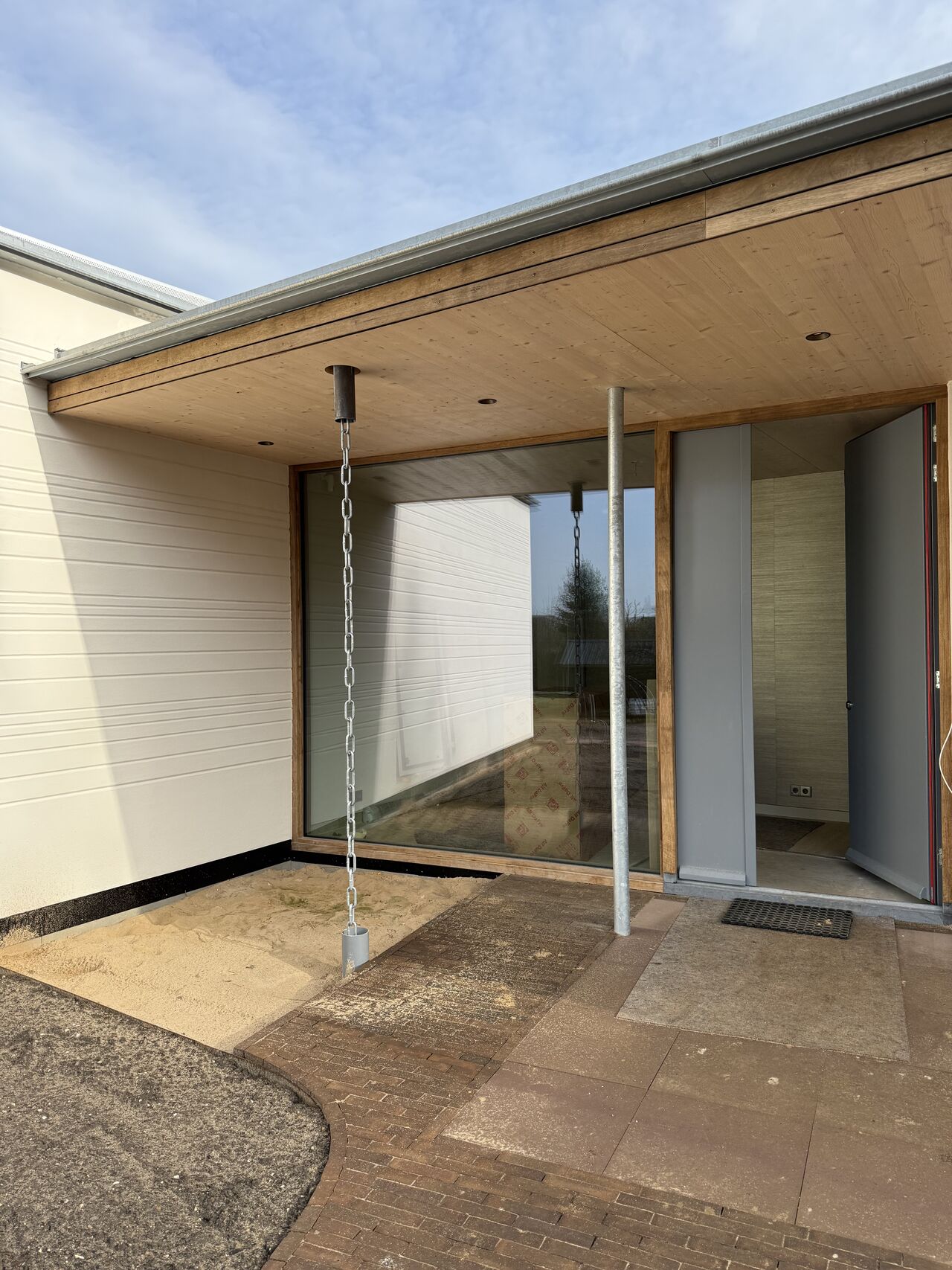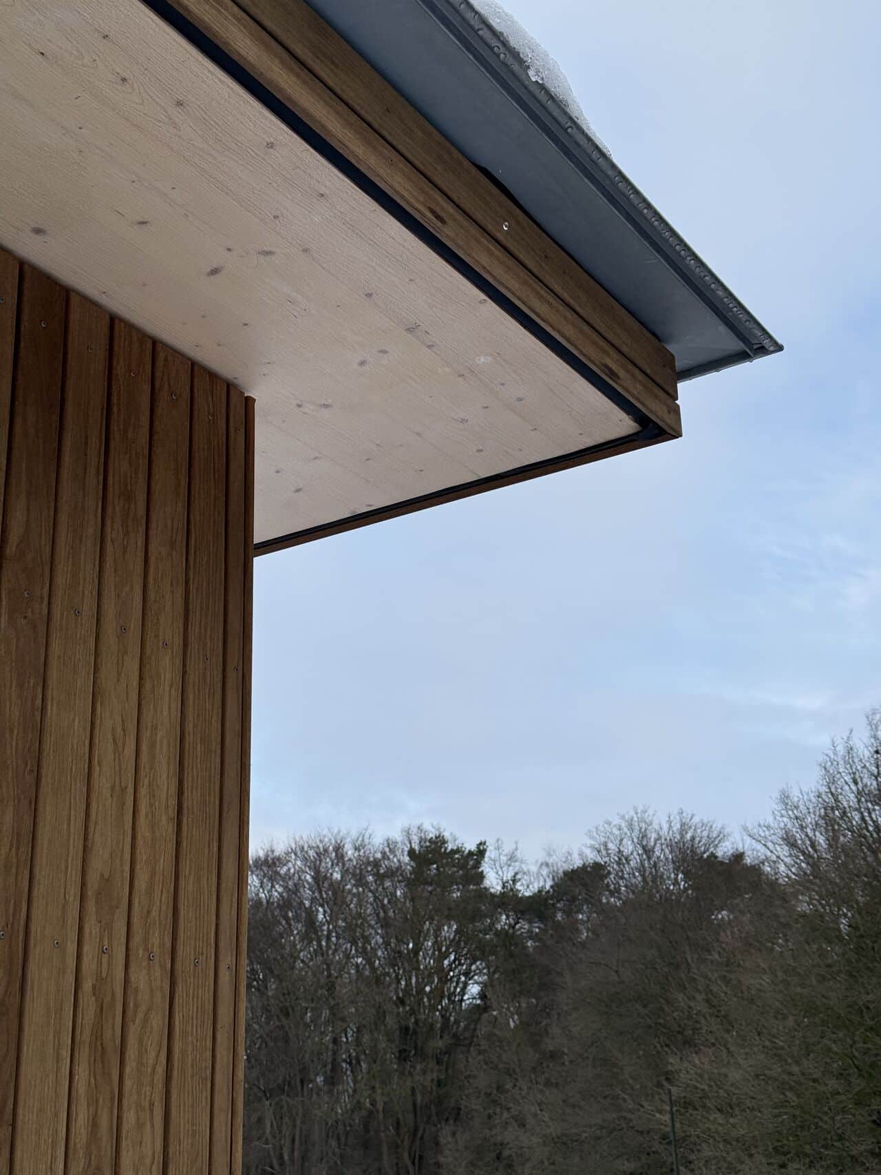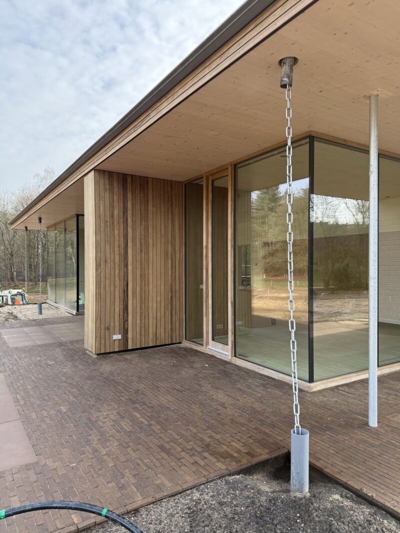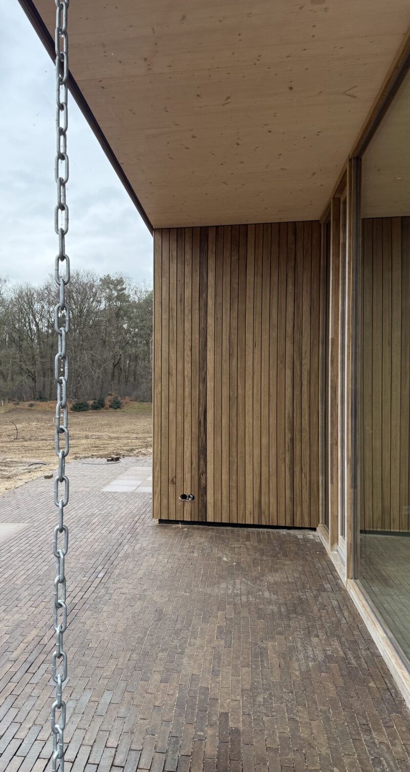 De ligging en daklijn volgen de zon en de omgeving. Diepe overstekken zorgen voor schaduw en beschutting, temperen het klimaat rondom de woning en versterken de overgang tussen binnen en buiten. Ze zijn niet toegevoegd, maar constructief verankerd in het ontwerp.
