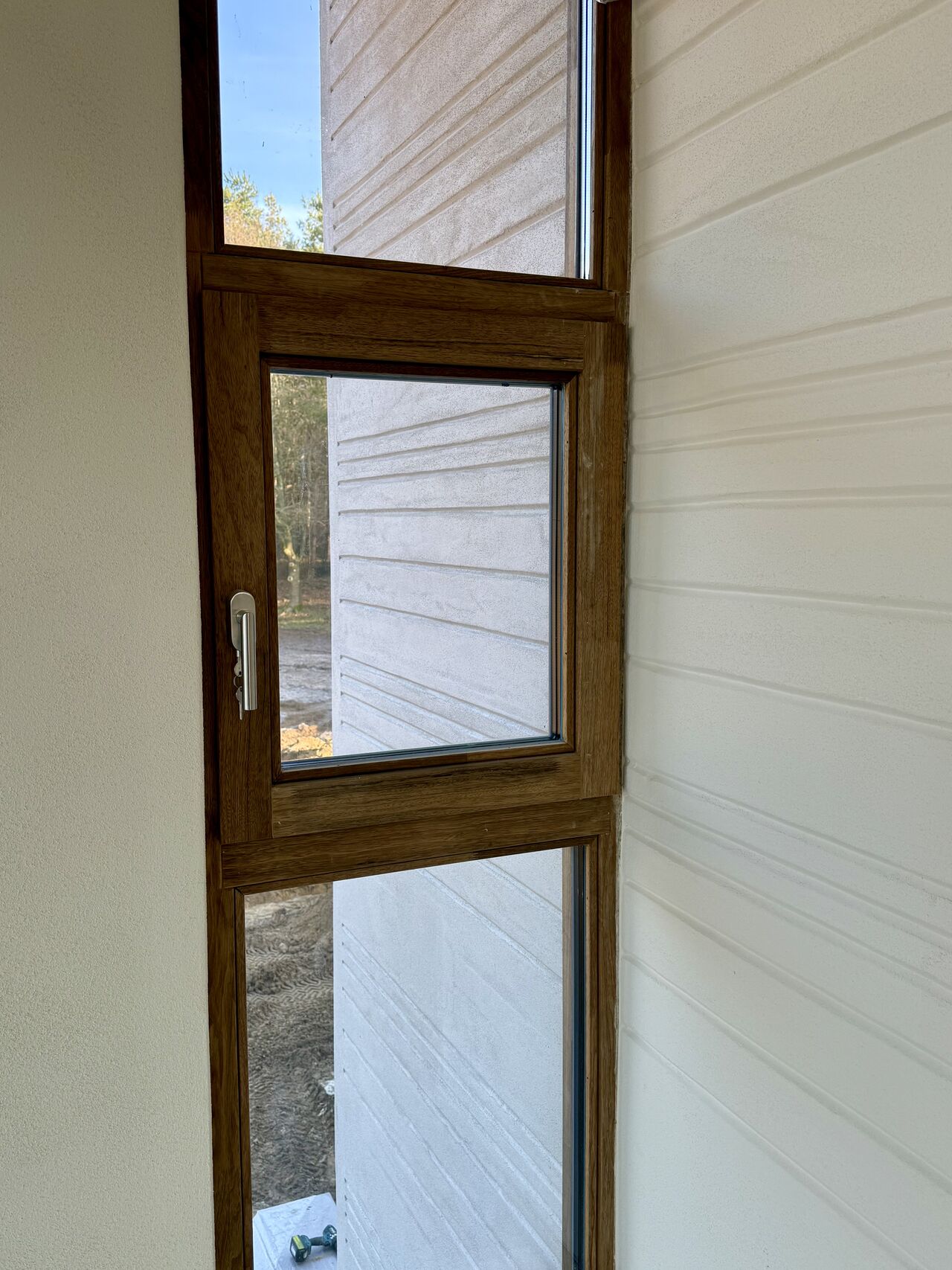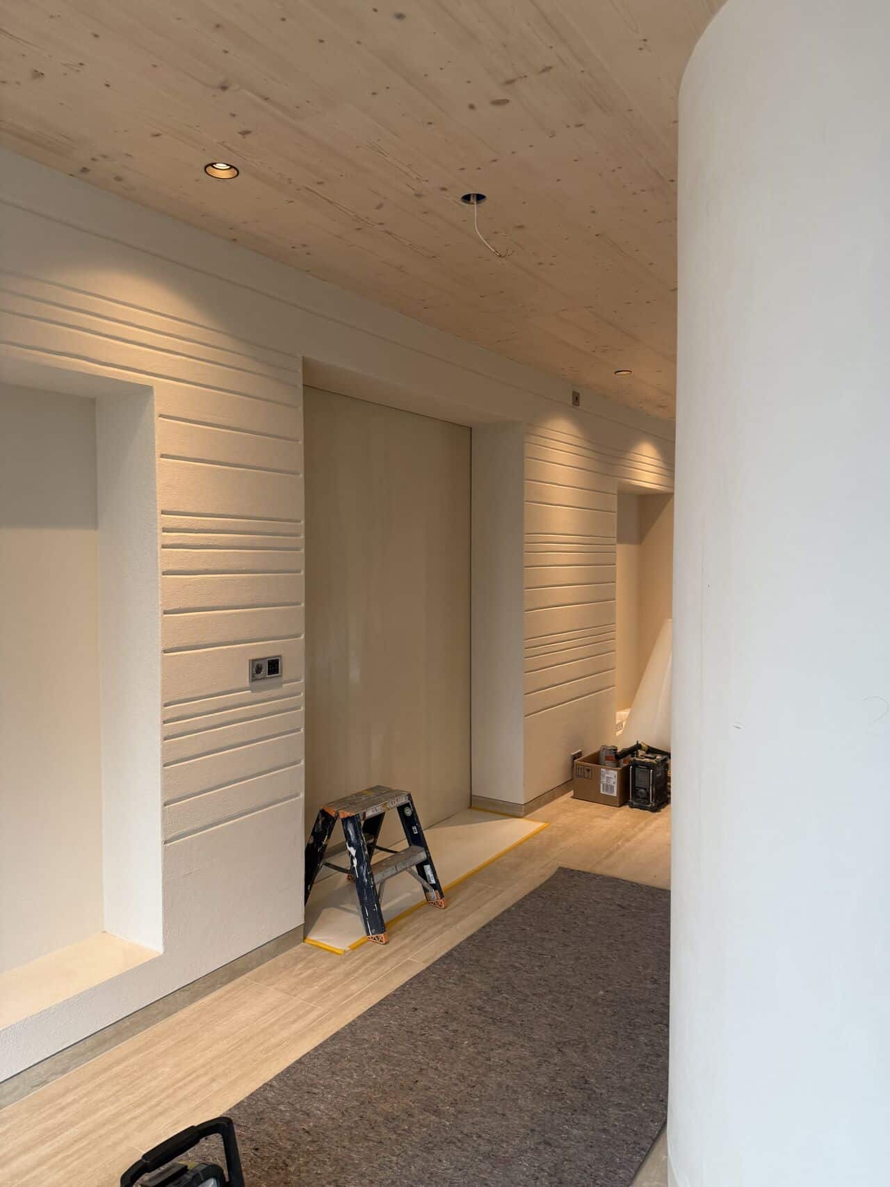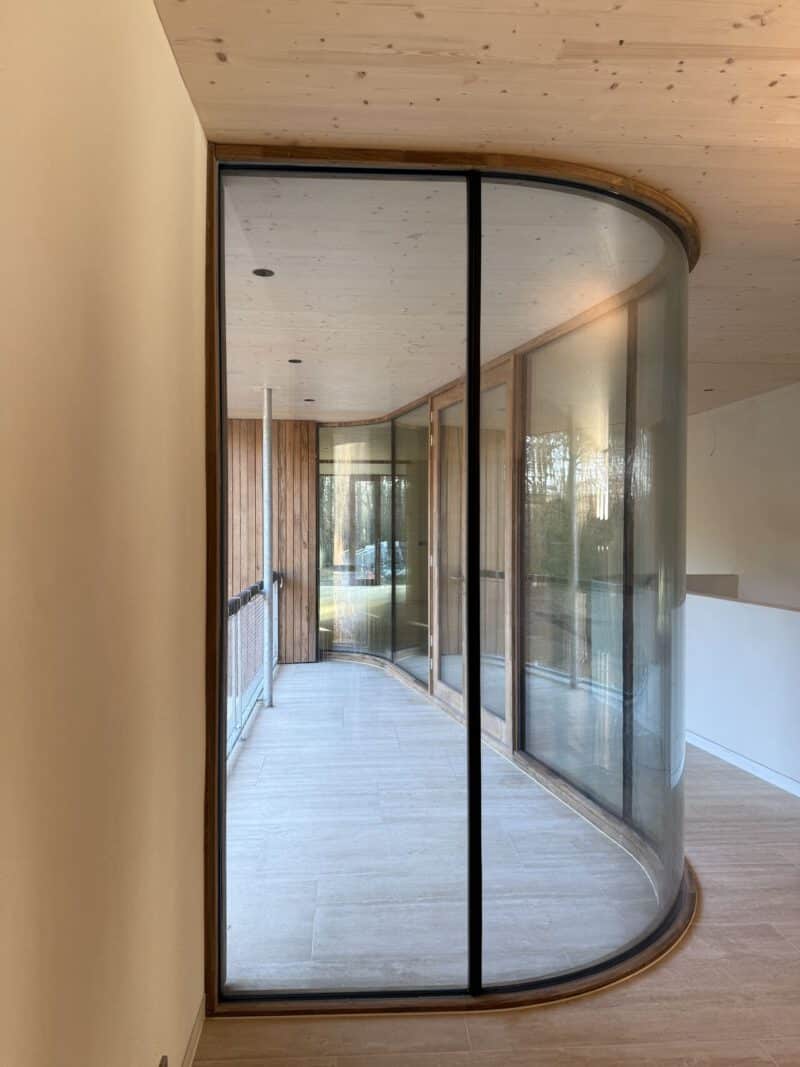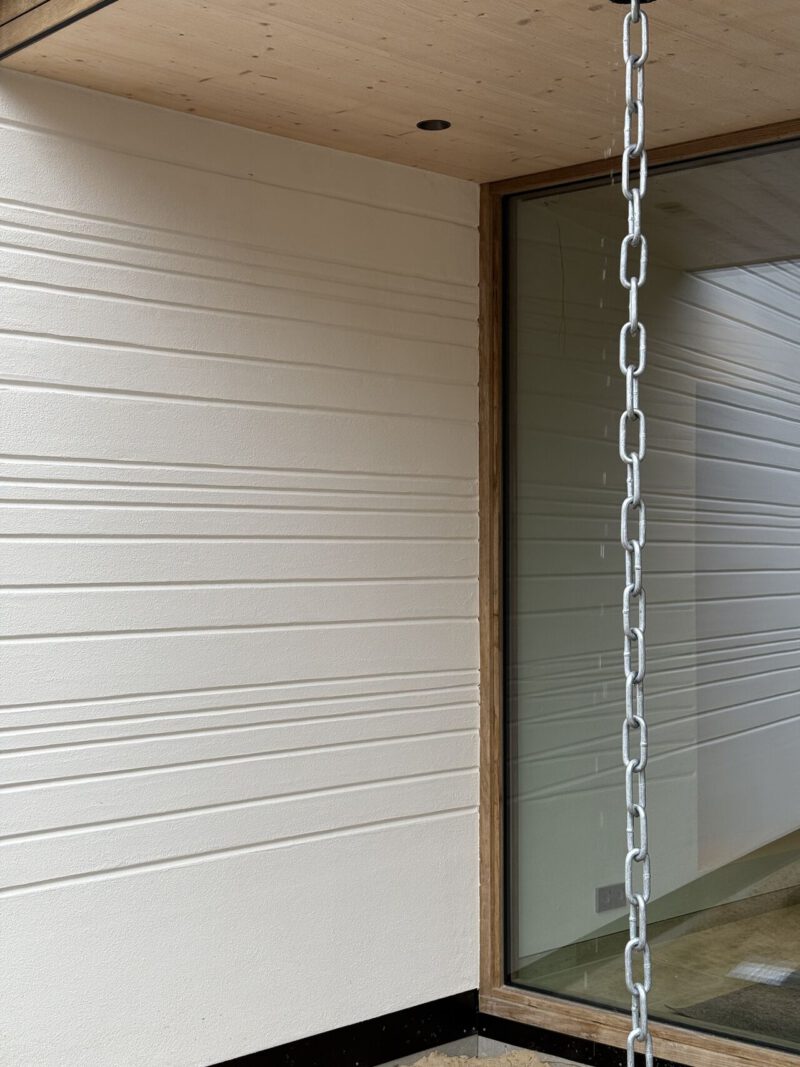 Aan de binnenzijde zorgt leemstuc voor een zachte, natuurlijke afwerking. Het materiaal reguleert vocht, verbetert de luchtkwaliteit en geeft de ruimtes een rustige, aardse uitstraling die het materiaalverhaal van de woning voelbaar maakt.