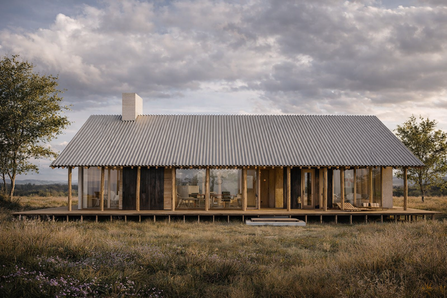 De woning staat licht op het maaiveld en wordt omringd door een houten vlonder die het wonen naar buiten toe verlengt. Binnen en buiten lopen vanzelfsprekend in elkaar over; grote openingen zorgen voor daglicht, uitzicht en een directe relatie met het omliggende grasland. De vlonder vormt geen harde scheiding, maar een overgang waarin dieren vrij tot aan de woning kunnen komen en onderdeel worden van het dagelijks beeld.