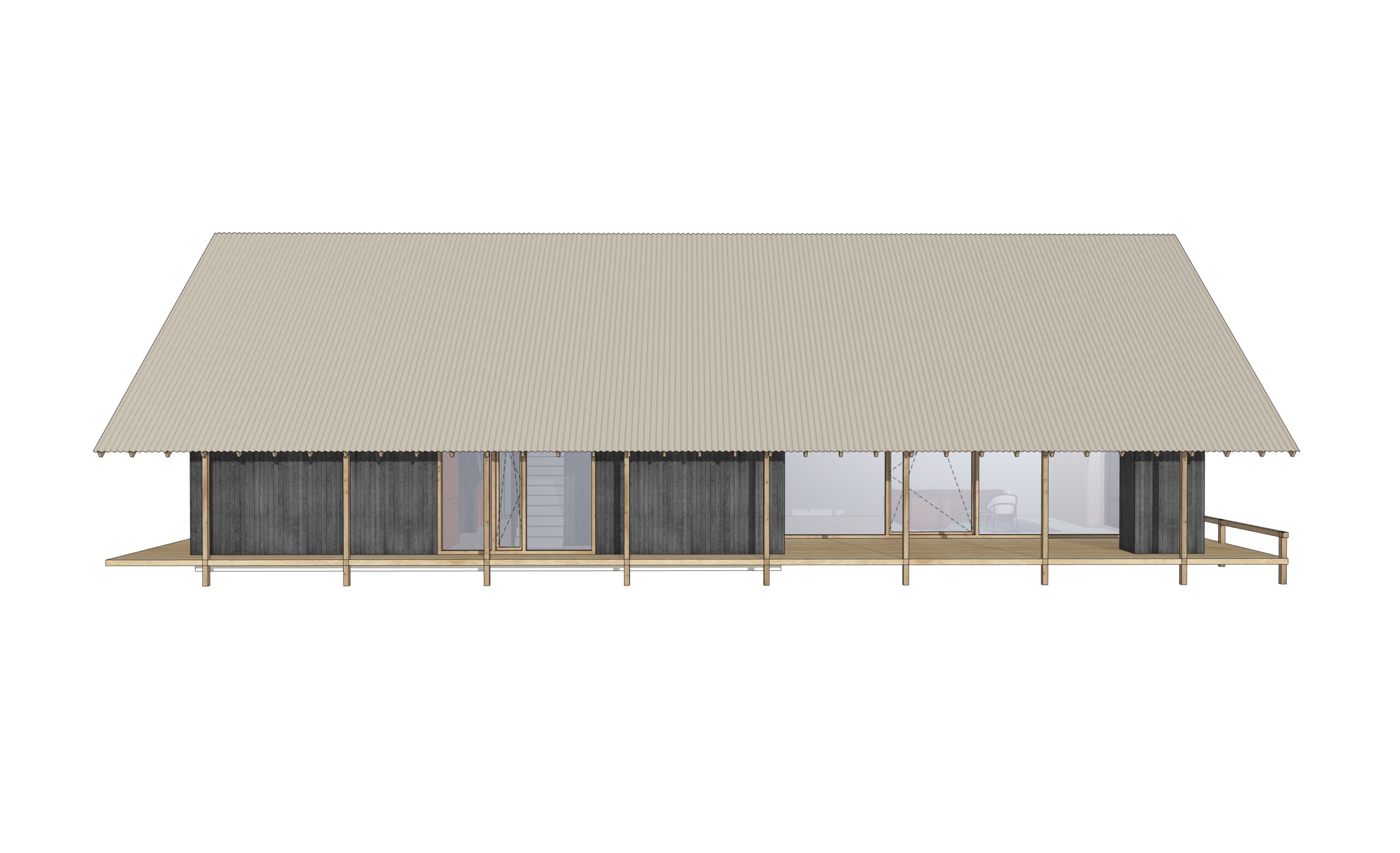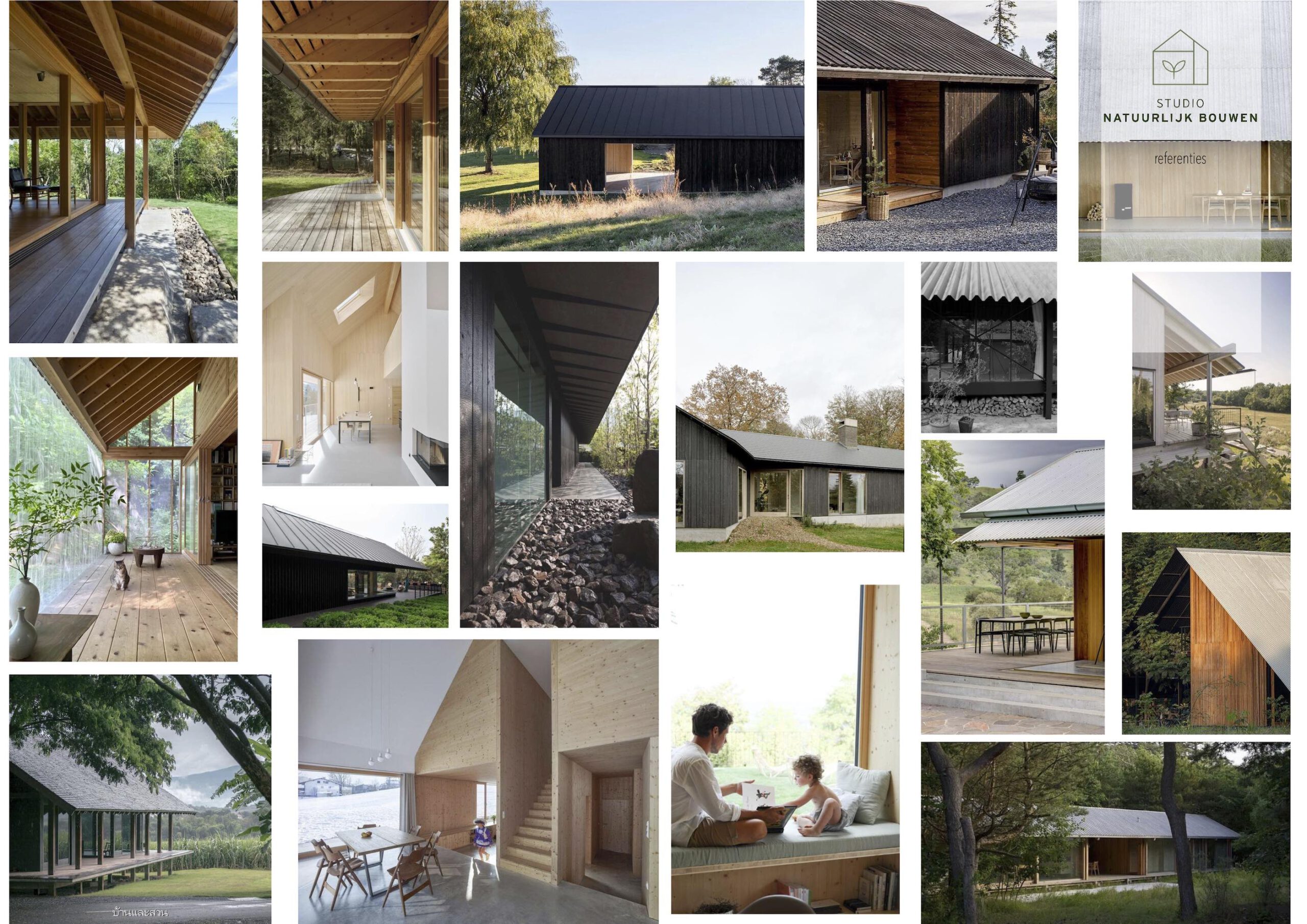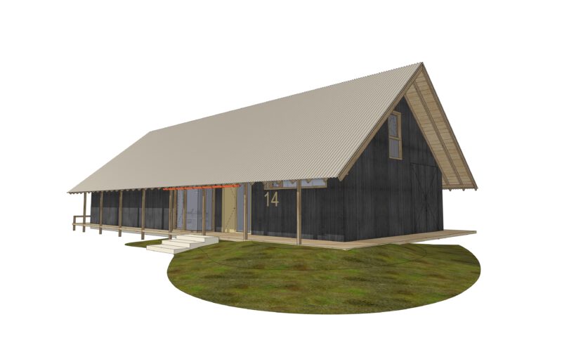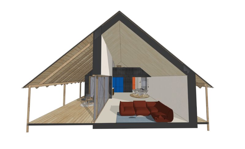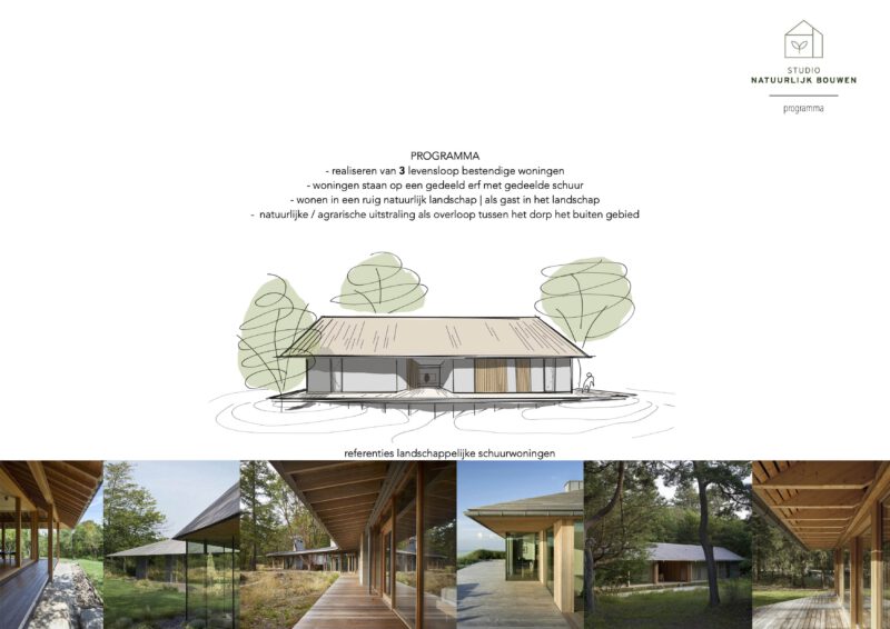 De drie woningen en twee schuurvolumes zijn zorgvuldig geclusterd rond een gezamenlijk erf. Hierdoor ontstaat een herkenbare erfstructuur met open doorzichten en een transparant, uitnodigend karakter. De schuren versterken de erfgedachte en geven het ensemble een landelijke verschijningsvorm in een eigentijdse interpretatie.