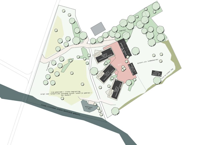 Het deel-erfconcept combineert de sfeer van een landelijk erf met modern wonen in de natuur. Centraal staat het idee van samen wonen op een erf in landschappelijk gebied, waarbij collectiviteit en ruimtelijke kwaliteit hand in hand gaan. Het plan maakt onderdeel uit van een nieuwe natuurontwikkeling nabij de uitlopers van de rivier, waardoor wonen en landschap elkaar wederzijds versterken.