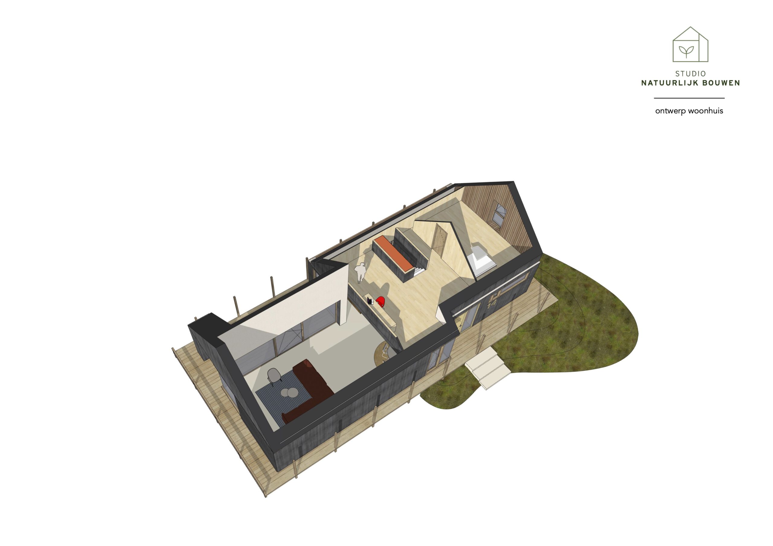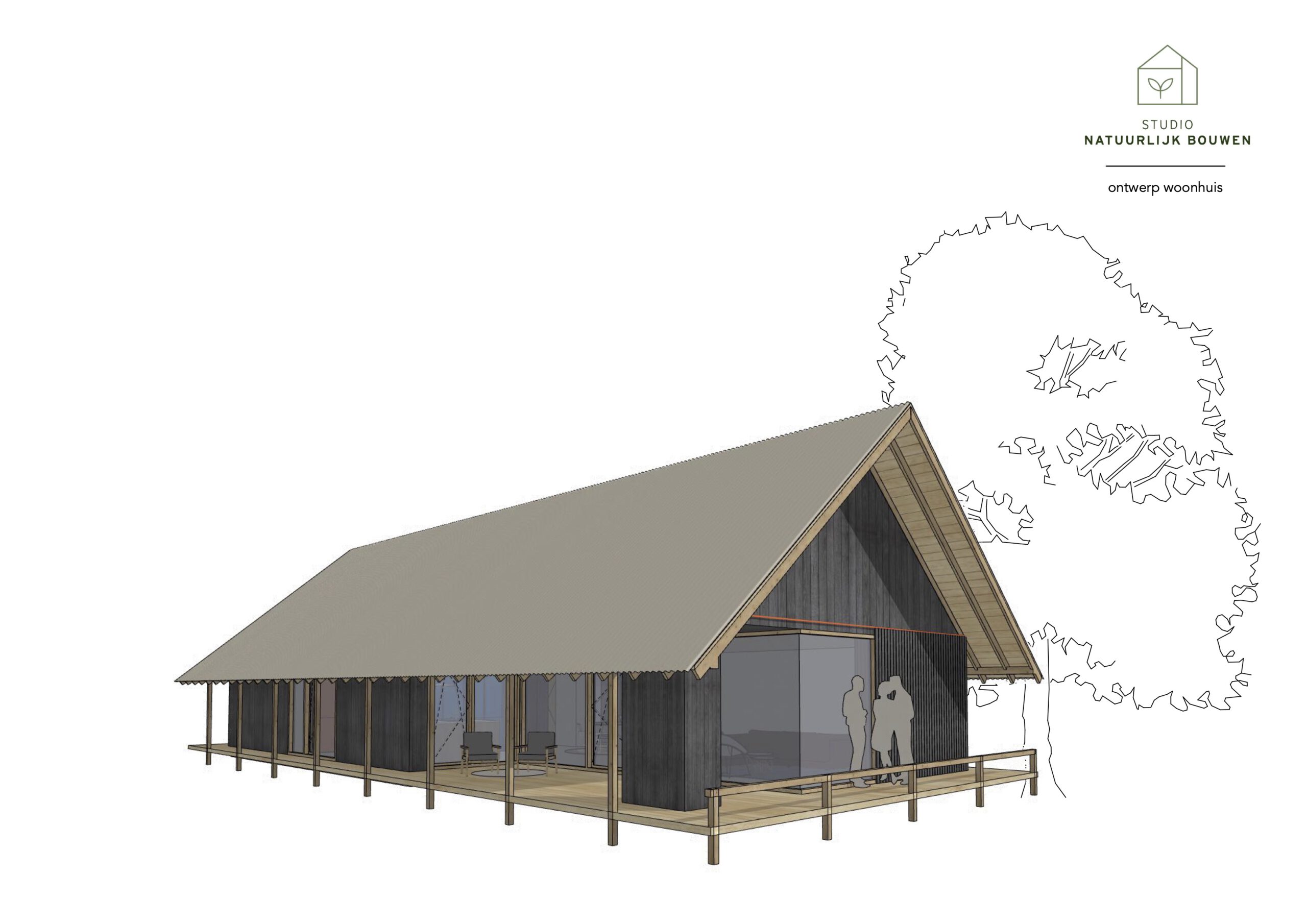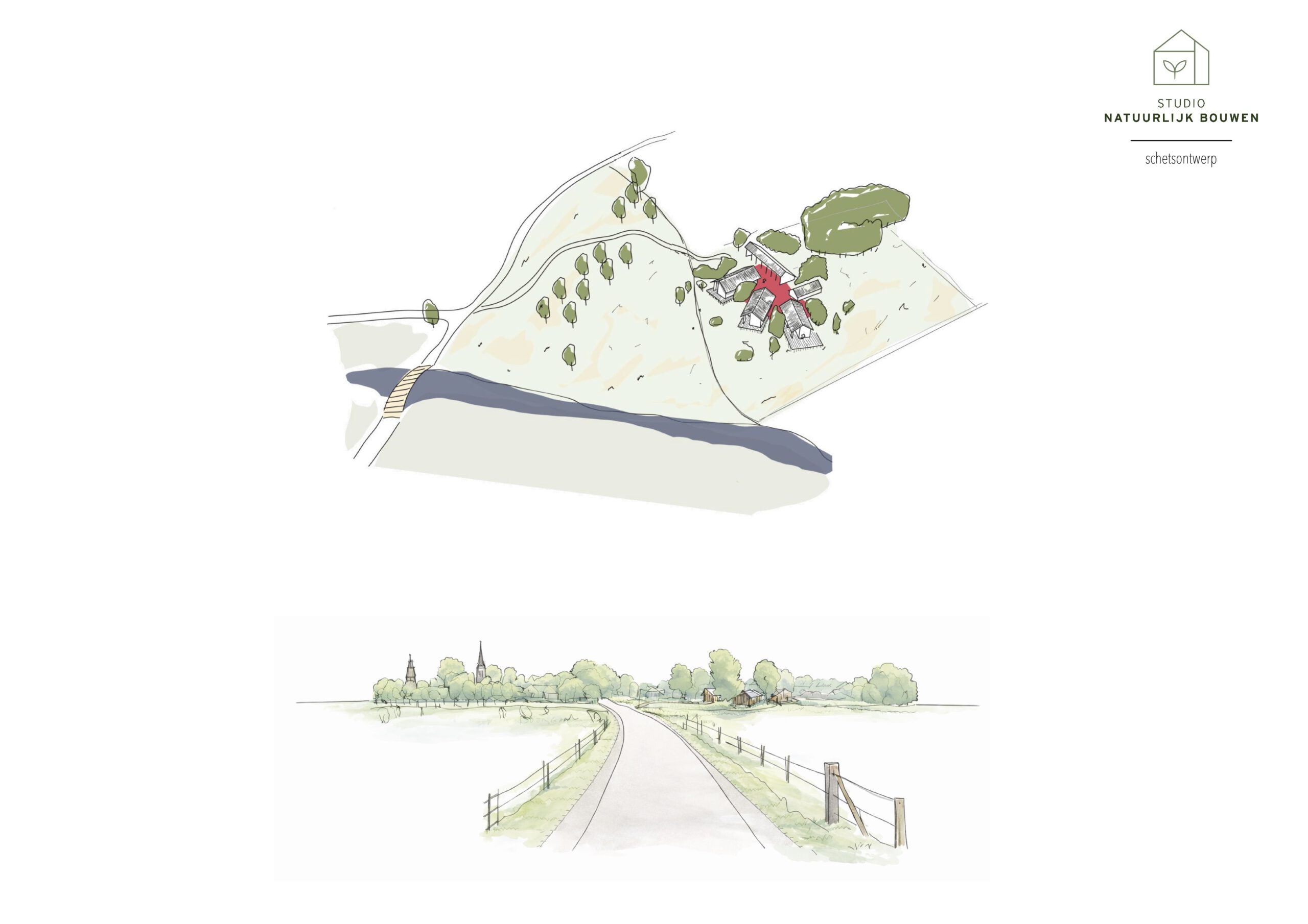 Vanaf Over de IJssel verschijnen de volumes als subtiele ‘gezichtjes’ uit de nieuw in te passen natuur, vanzelfsprekend ingebed in het landschap. Het erf wordt benaderd via een kronkelpad, wat de landschappelijke beleving en de geleidelijke overgang van openbaar naar privé versterkt.